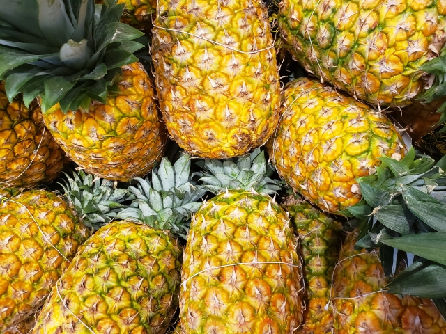 選ぶ際は、ずっしりと重みがあり、甘い香りが強く漂っているものを選びましょう。お尻(底の部分)が黄色っぽくなっているものは熟している証拠です。パイナップルは追熟(収穫後に甘くなること)しないため、買った時が一番の食べ頃です。